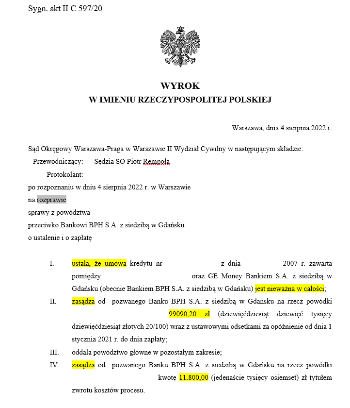 Bank BPH siedzibą w Gdańsku, Sąd Okręgowy Warszawa-Praga w Warszawie II Wydział Cywilny akt: II C 597/20 – o zapłatę pieniędzy