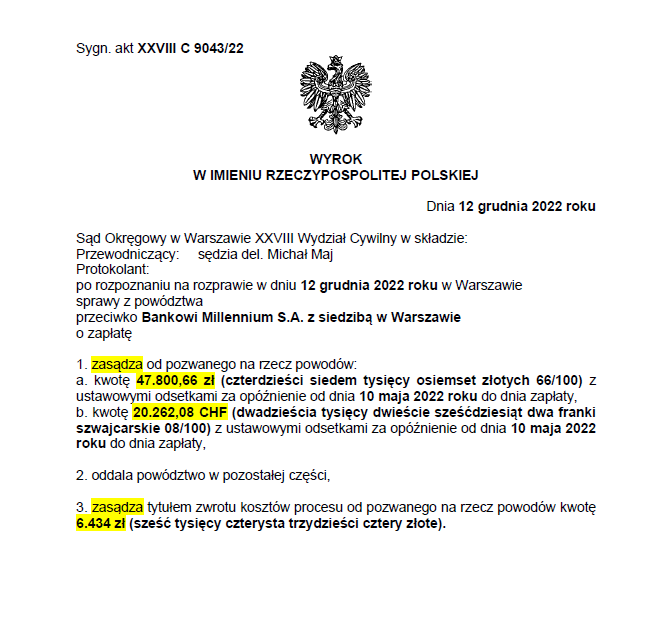 Bank Millennium S.A. z siedzibą w Warszawie, Sąd Okręgowy w Warszawie, XXVIII Wydział Cywilny, Sygn. akt: XXVIII C 9043/22 – o zapłatę pieniędzy