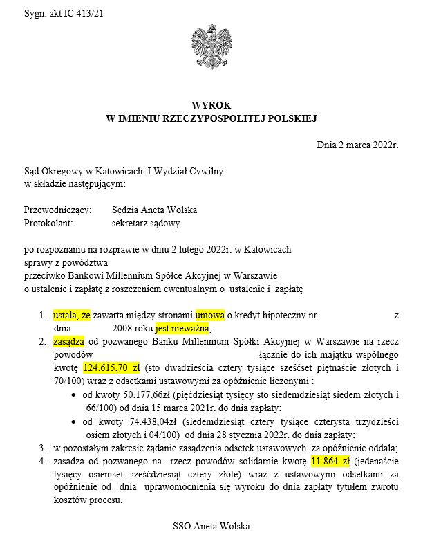 Bank Millennium S.A. z siedzibą w Warszawie, Sąd Okręgowy w Katowicach – Mokotowa, I Wydział Cywilny, Sygn. akt: IC 413/21