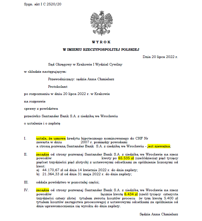 Bank Santander z siedzibą we Wrocławiu, Sąd Okręgowy w Krakowie I Wydział Cywilny, Sygn. akt: I C 2520/20 – o zapłatę pieniędzy