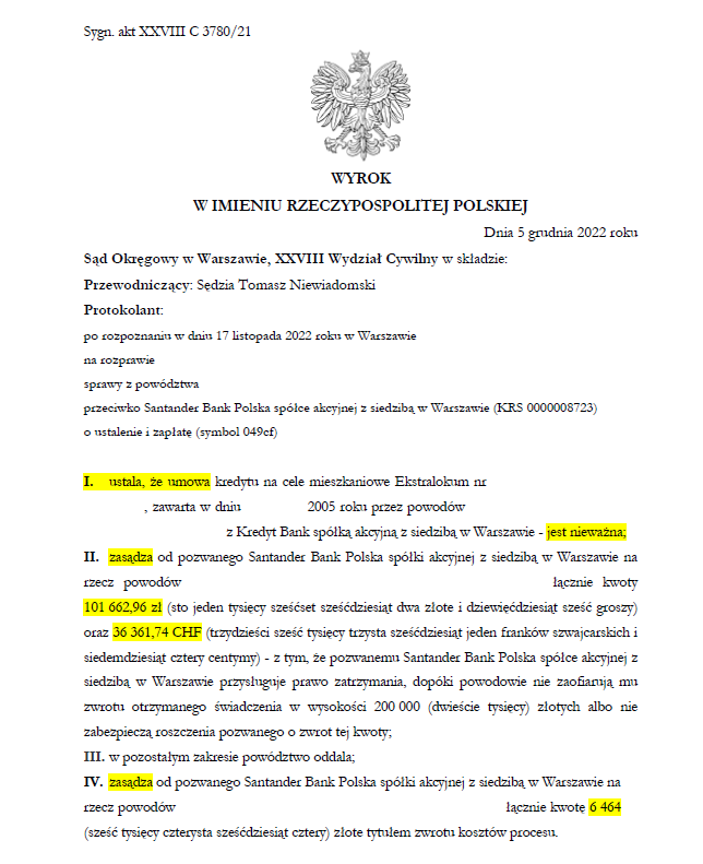 Bank Santander z siedzibą w Warszawie, Sąd Okręgowy w Warszawie, XXVIII Wydział Cywilny, Sygn. akt: XXVIII C 3780/21 – o zapłatę pieniędzy
