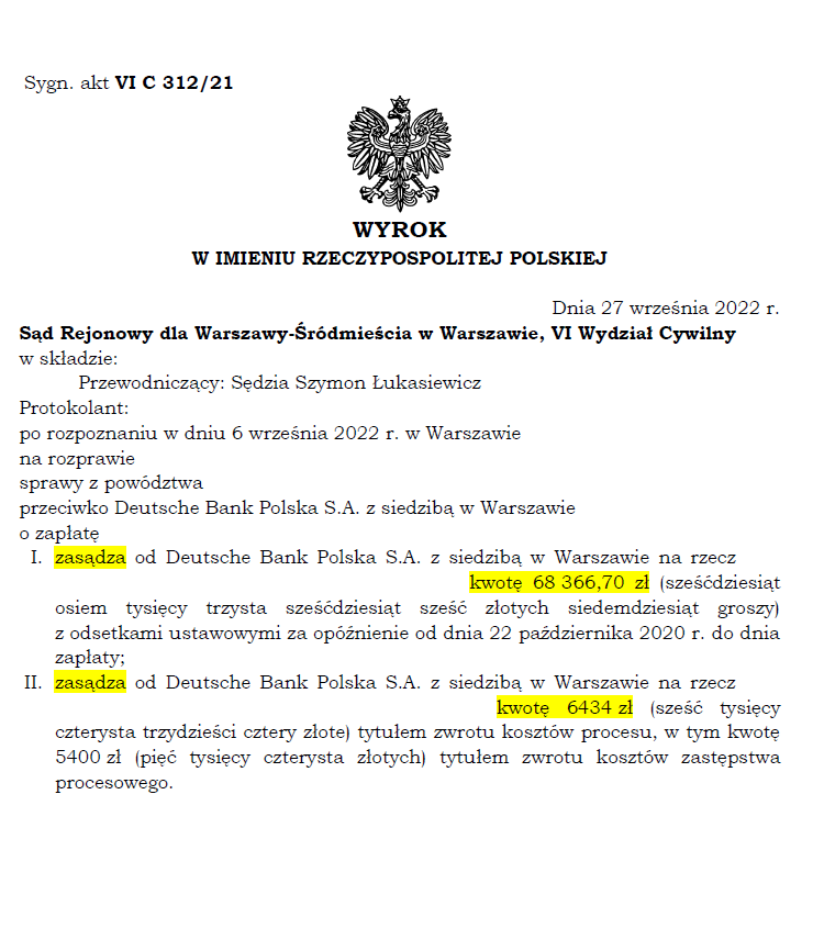 Wygrana przeciwko Deutsche Bank Polska S.A