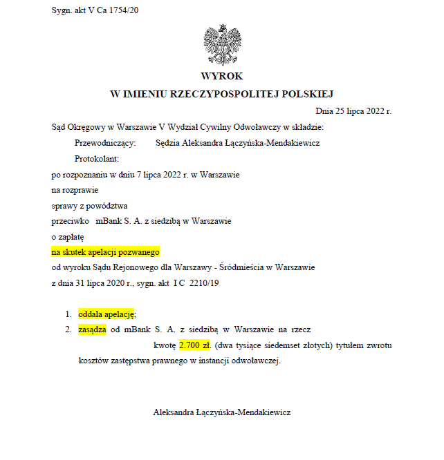 mBank S.A. z siedzibą w Warszawie, Sąd Okręgowy w Warszawie V Wydział Cywilny, Sygn. akt: – V Ca 1754/20 – o zapłatę pieniędzy