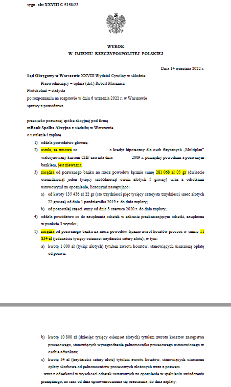 mBank S.A. z siedzibą w Warszawie, Sąd Okręgowy w Warszawie XXVIII Wydział Cywilny, Sygn. akt: XXVIII C 5153/22 – o zapłatę pieniędzy