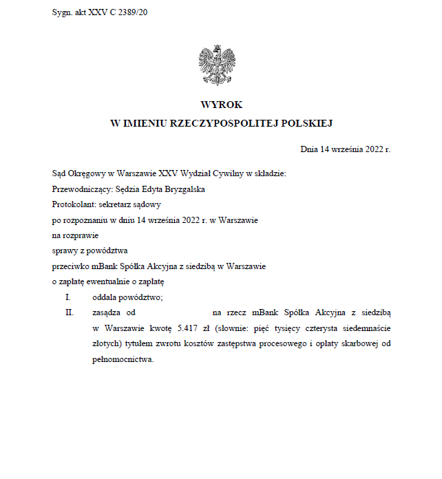 mBank S.A. z siedzibą w Warszawie, Sąd Okręgowy w Warszawie XXV Wydział Cywilny, Sygn. akt: XXV C 2389/20 – o zapłatę pieniędzy