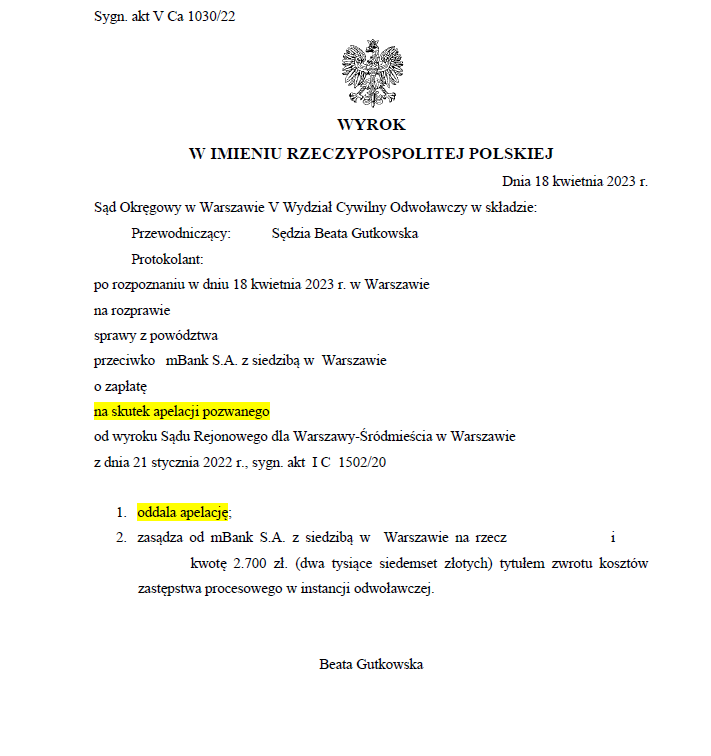 mBank S.A. z siedzibą w Warszawie, Sąd Okręgowy w Warszawie V Wydział Cywilny, Sygn. akt: V Ca 1030/22 – o zapłatę pieniędzy