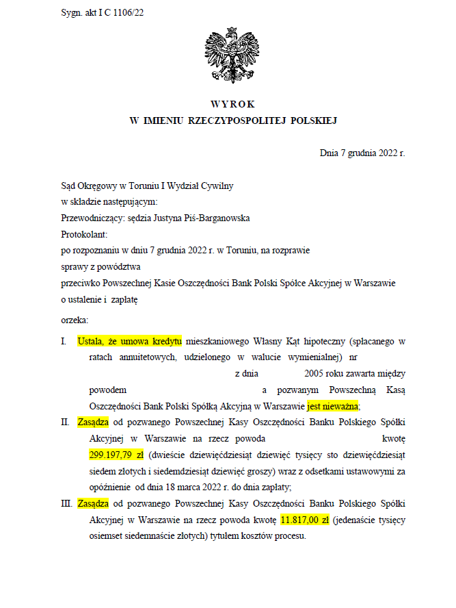 Powszechnej Kasie Oszczędności Bankowi Polskiemu Spółce Akcyjnej siedzibą w Warszawie, Sąd Okręgowy w Torunui VI I Wydział Cywilny, Sygn. akt: I C 1106/22 – o zapłatę pieniędzy