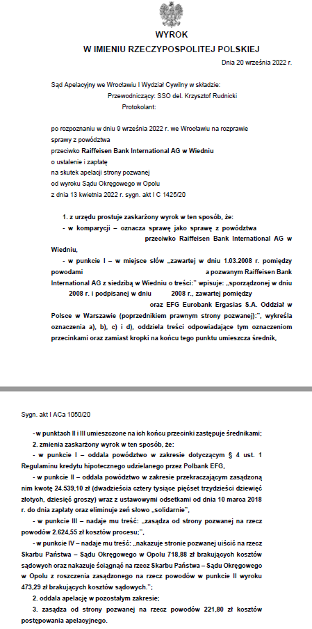 Raiffeisen Bank International AG S.A. z siedzibą w Wiedniu, Sąd Apelacyjny we Wrocławiu I Wydział Cywilny, Sygn. akt: ACa 1050/20 – o zapłatę pieniędzy