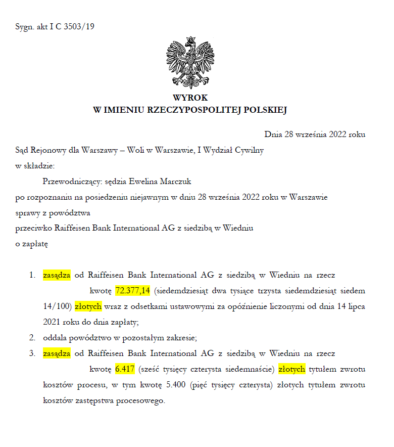 Raiffeisen Bank International AG S.A. z siedzibą w Wiedniu, Sąd Rejonowy dla Warszawy – Woli w Warszawie, I Wydział Cywilny, Sygn. akt: I C 3503/19 – o zapłatę pieniędzy