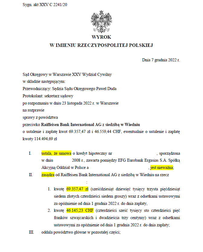 Raiffeisen Bank International AG S.A. z siedzibą w Wiedniu, Sąd Okręgowy w Warszawie, XXV Wydział Cywilny, Sygn. akt: XXV C 2241/20 – o zapłatę pieniędzy