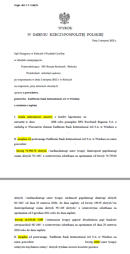 Raiffeisen Bank International AG S.A. z siedzibą w Wiedniu, Sąd Okręgowy w Kielcach I Wydział Cywilny, Sygn. akt: I C 1248/21 – o zapłatę pieniędzy
